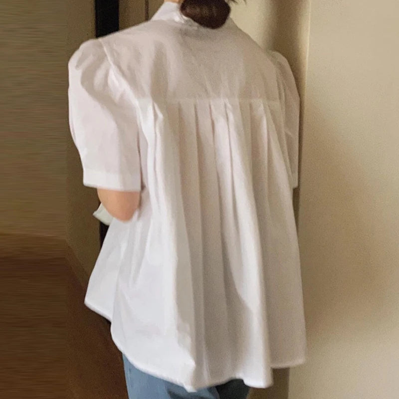 Women’s Summer Shirt – Chic Loose Fit with Bubble Sleeves & Pleated Turn-Down Collar